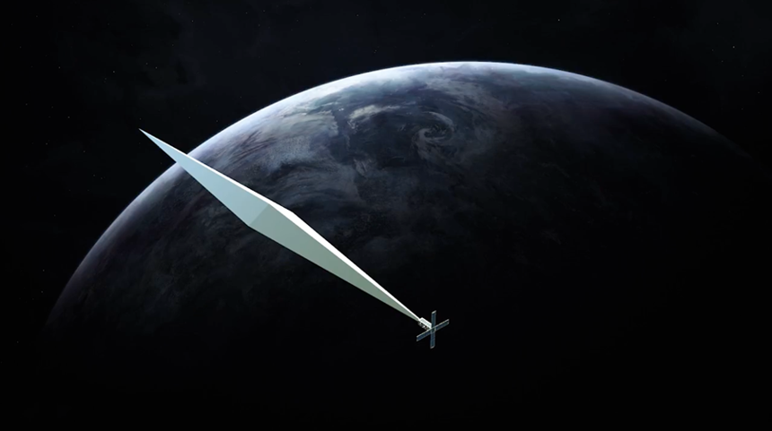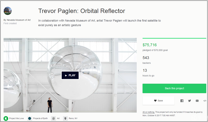 特雷佛·帕格倫的這項藝術品是把一種類近聚酯薄膜的輕質材料,制造成外型似鉆石的軌道反射器。它被安置在被稱為CubeSat的小型盒狀基礎設施中,并被火箭發射到太空中。