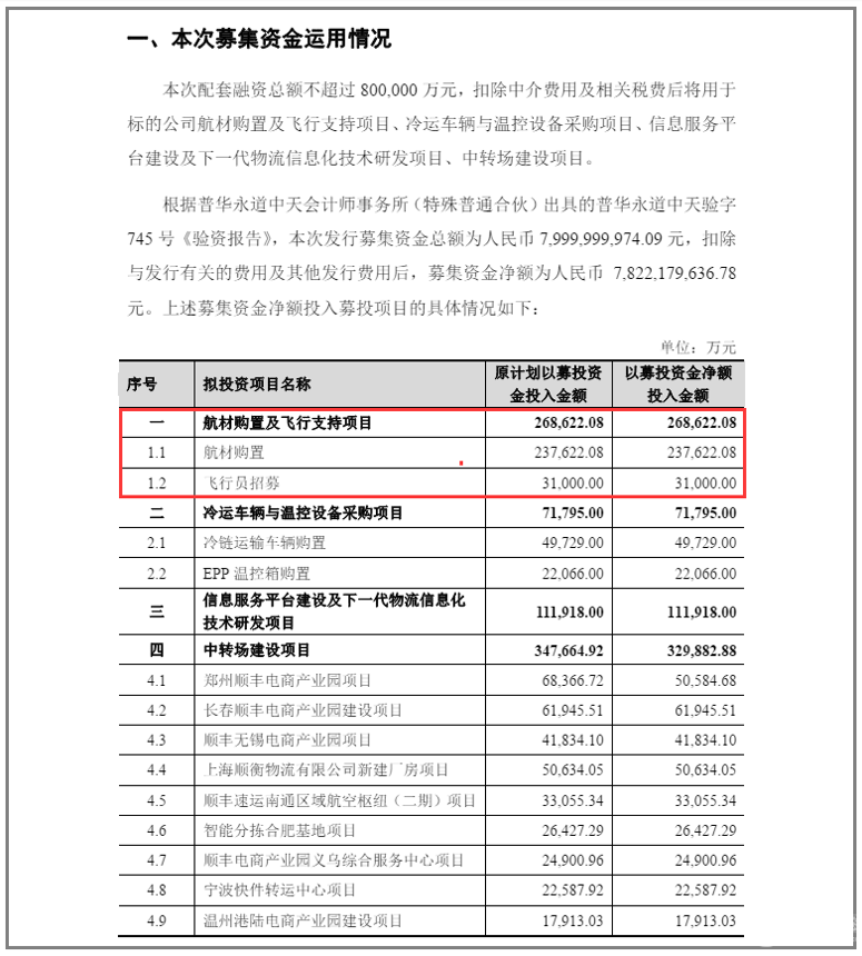 根據(jù)其公告,本次發(fā)行募集資金凈額全部用于深圳順豐泰森控股(集團)有限公司(簡稱“順豐泰森”)航材購置及飛行支持項目、冷運車輛與溫控設備采購項目、信息服務平臺建設及下一代物流信息化技術(shù)研發(fā)項目、中轉(zhuǎn)場建設項目。其中,23.76億元用于購置航材,3.1億元用于飛行員招募。
