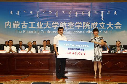 內蒙古工業大學航空學院的成立得到該校校友的廣泛關注,為支持母校的航空教育事業,北京校友會出資100萬元設立了航空發展基金。成立大會上,北京校友會秘書長郝冰向航空學院轉交了基金。