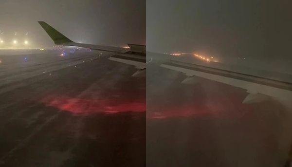 現(xiàn)場(chǎng)視頻和照片顯示,飛機(jī)完全停下時(shí),機(jī)頭方向和跑道幾乎呈現(xiàn)90度直角,乘客可直接透過窗口見到原本用于指示跑道位置和范圍的跑道燈。