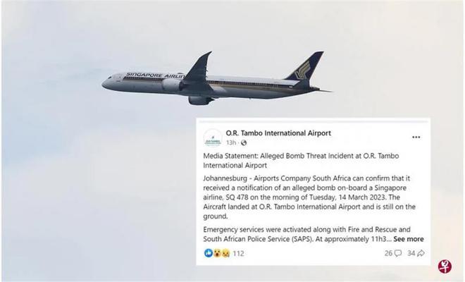 ? ? ? ?約翰內斯堡奧立弗·坦博國際機場3月14日在社交媒體發文說,南非機場服務公司證實,在當天早上接到通報,指新航SQ478航班上有炸彈。