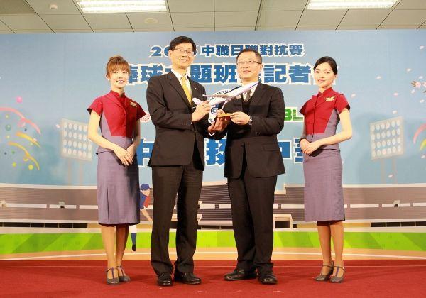 華航總經理張有恒今天出席“2016中職日職對抗賽中華挺中華棒球主題班機”開賣記者會,與中華職棒聯盟會長暨中職代表隊領隊吳志揚互贈本次執飛的A330飛機模型,以及背號56號、象徵華航成立56周年的特別版球衣,透過雙方結盟儀式,發揮“中華挺中華”的精神。同時中職代表隊球員王溢正、周思齊、高國輝、陳鏞基也現身會場一起同樂,華航空服員特別組成啦啦隊,現場秀熱舞為中職代表隊打氣。