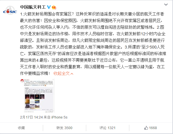 2月17日下午2時許,中國航天科工集團公司在官方微博上回應。針對網友描述稱“火箭撞山擊中家屬區”這一細節,“中國航天科工”解釋稱,“因安全和保密原因,火箭發射場周圍絕不允許有家屬區或者居民區,也不允許任何閑雜人等入內。”