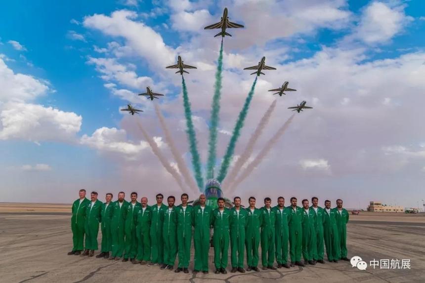 本屆航展的一個(gè)亮點(diǎn)是沙特阿拉伯皇家空軍“沙特之鷹”特技飛行表演隊(duì)前來(lái)參展,這將是“沙特之鷹”在中國(guó)的首次亮相。“沙特之鷹”飛行表演隊(duì)成立于1998年,是為慶祝1999年沙特阿拉伯建國(guó)100周年而建立。表演隊(duì)駐地在塔布克市的費(fèi)薩爾國(guó)王空軍基地,使用Hawk MK65A式高級(jí)教練機(jī),為7機(jī)編隊(duì)。該表演隊(duì)在空中的表演分為兩部分,一部分以編隊(duì)形式密集的進(jìn)行各種機(jī)動(dòng)飛行,以標(biāo)志性的畫(huà)“國(guó)徽”動(dòng)作收尾;另一部分編隊(duì)分成幾個(gè)小組,為現(xiàn)場(chǎng)觀(guān)眾輪番上演驚險(xiǎn)刺激的高難度特技飛行動(dòng)作。