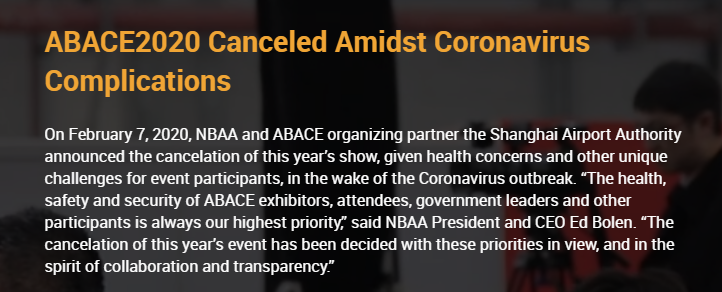 美國公務航空協會總裁兼首席執行官埃德·博倫(Ed Bolen)致信ABACE2020參展商說,鑒于新型冠狀病毒疫情在中國的傳播,以及隨之帶來的巨大挑戰,美國公務航空協會(NBAA)決定取消2020年亞洲商務航空大會及展覽會(ABACE2020)。美國公務航空協會經過審慎考慮和研究,并在上海機場集團的協調下做出了這個決定。