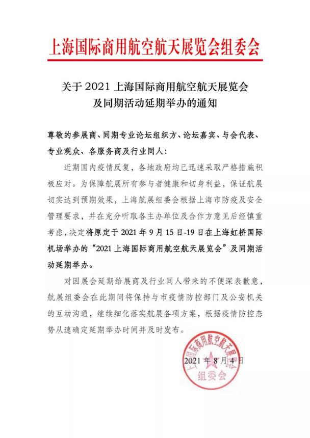 2021上海國際商用航空航天展覽會及同期活動延期舉行