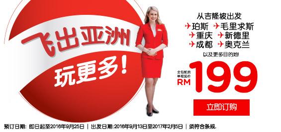 想飛往更遠,并節省更多旅費的乘客可前往奧克蘭、珀斯、毛里求斯、新德里、東京、札幌、首爾、釜山及臺北,單程含稅全包價格只需342人民幣(199 馬幣) 起。