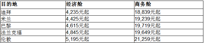 從廣州出發的中國乘客可選擇前往歐洲、英國、南美洲、非洲、中東地區、馬爾代夫以及巴基斯坦等地區的眾多目的地。阿聯酋航空推出的經濟艙特價4,235元起,商務艙特價18,839元起,具體價格取決于目的地。所有價格已包含燃油附加費和其他稅費。