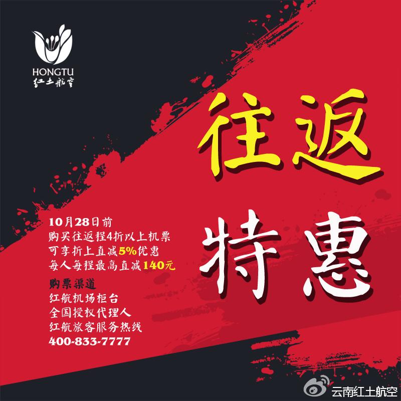 云南紅土航空即日起至10月28日推出“多人特惠”、“往返特惠”等機票產品和“有獎密令”購票有禮活動,為廣大旅客假期出游帶來更多實惠和樂趣。