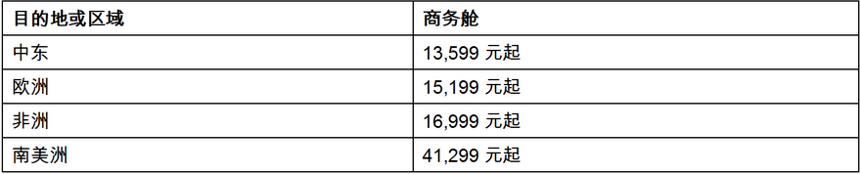 即日起到2016年11月6日期間,從中國大陸出發的旅客預訂旅行時段在2016年10月24日至2017年4月30日內(部分日期除外)的阿聯酋航空商務艙可享受此優惠,票價低至13,599元起。乘客可前往包括歐洲、非洲(含印度洋群島)、中東(含海灣地區)和南美的眾多目的地。部分地區和價格參見下表: