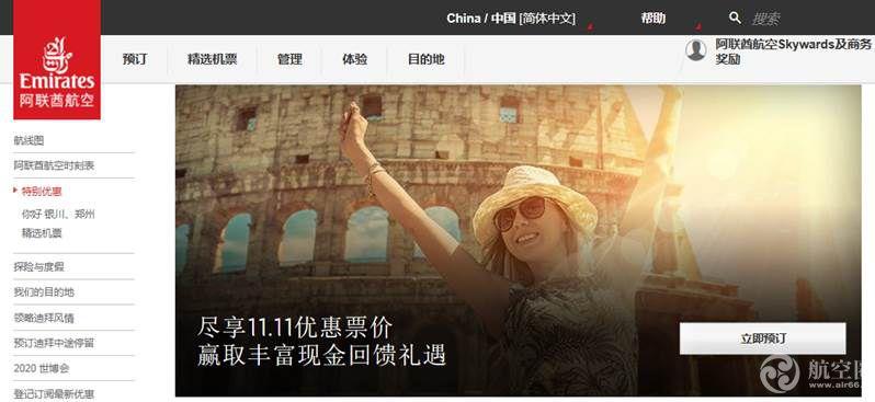 阿聯(lián)酋航空推出11?11機(jī)票特惠與返現(xiàn)雙重禮遇,助力中國(guó)乘客暢享購物狂歡節(jié)。從2016年11月7日起,乘客可享受11個(gè)精選目的地的特價(jià)機(jī)票并有機(jī)會(huì)獲得返現(xiàn)大獎(jiǎng)。