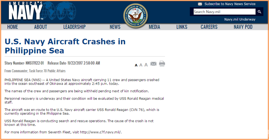 根據(jù)美國海軍的聲明,當?shù)貢r間11月22日大約下午2點45分鐘分發(fā)生墜機事件。