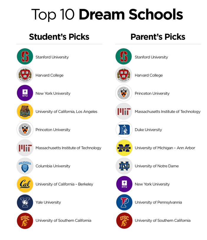 加利福尼亞大學洛杉磯分校、哥倫比亞大學、加利福尼亞大學伯克利分校和耶魯大學四所名校進入學生最喜歡大學榜前10,而沒有進入家長最喜歡大學榜前10,家長榜單另外四所大學是杜克大學(Duke University) 、密歇根大學安娜堡分校(University of Michigan-Ann Arbor)、圣母大學(University of Notre)、賓夕法尼亞大學(University of Pennsylvania )。