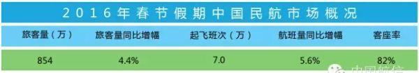 2016年春節假期(2月7日至2月13日)中國民航市場共運送旅客854萬余人次,同比增幅4.4%;起降航班量7萬余班;平均客座率82%,較去年春節假期下降了3個百分點。