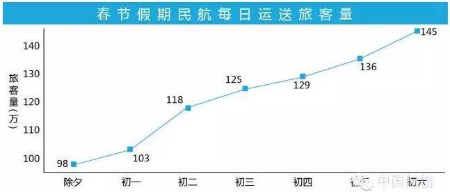 假期中民航旅客量步步攀升,由于春節旅客多提前返鄉,除夕單日旅客量最少,不足百萬;其余6天全民航市場旅客量均突破百萬。初六為集中返程日,旅客量達到145萬,較去年春節假期峰值日多運送近5萬人次。