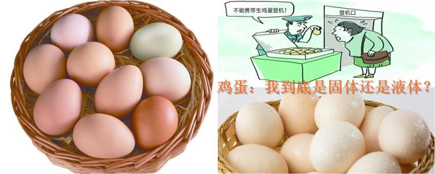 生雞蛋算液體還是固體?重慶機場日前就遇到這難解的問題,有旅客要帶一箱雞蛋上飛機,安檢人員說是液體需要托運,旅客堅持是固體,僵持到最后飛機飛走了。次日旅客花150元包裝費托運