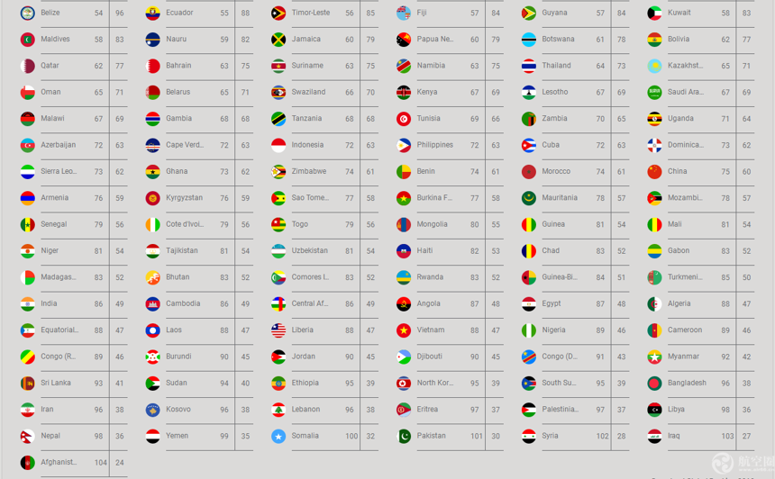 航空圈發現,整體上,歐洲和北美、大洋洲國家排名靠前,非洲和亞洲一些貧窮和不穩定地區排名靠后。