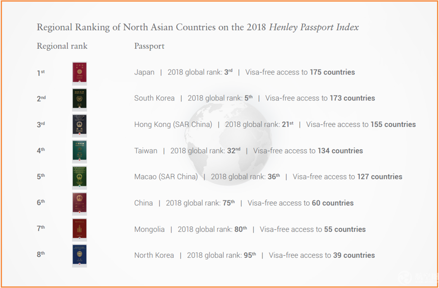 東北亞地區2018年護照排行榜,日本、韓國、香港位居前三。