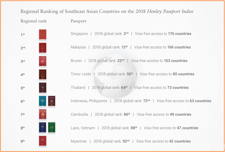 東南亞地區2018年護照排行榜,新加坡、馬來西亞和文萊位居前三。
