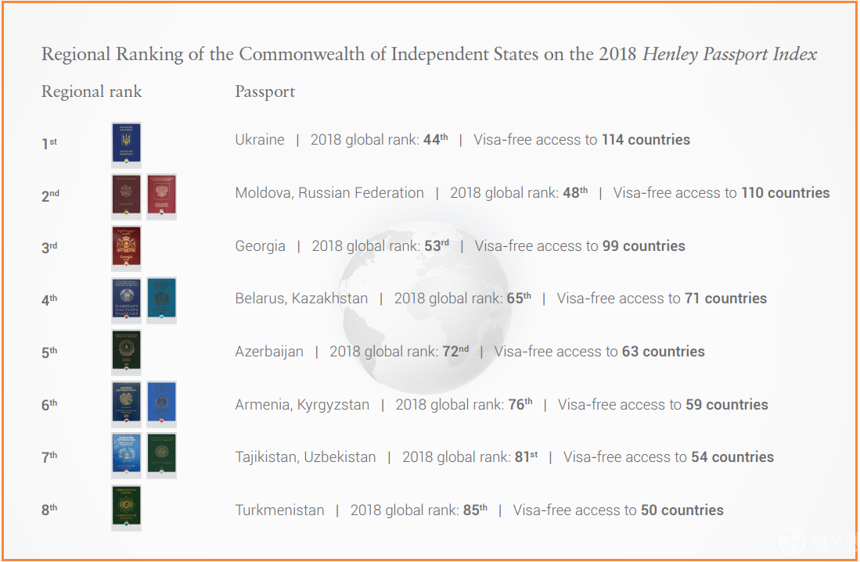 俄羅斯和獨立體國家2018年護照排名,烏克蘭排名第一,摩爾多瓦和俄羅斯排第二。