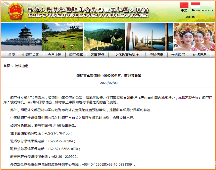 中國駐印尼使館提醒中國公民關注印尼方有關入境限制等臨時措施,合理安排出行。