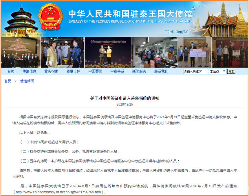 中國駐泰國大使館:申請中國簽證的人員需要采集指紋