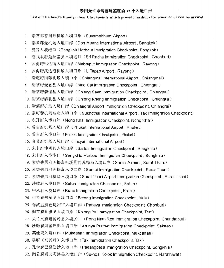 根據泰國內政部公告,持有中國大陸護照的公民可在泰國各個入境處申請有效期為15天的赴泰落地簽證。目前,泰國素萬那普國際機場、廊曼國際機場、清邁國際機場、普吉島國際機場等32個入境口岸可以試試落地簽。