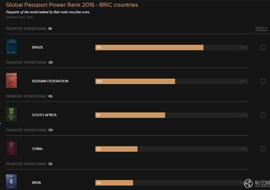 金磚五國中,剛剛舉辦里約奧運會的巴西以141個免簽地位居第16位,俄羅斯以104個居第39位,南非以91個位居第45位,中國以55個排名第70位,印度以49個排在76位。