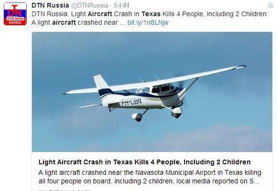 美國(guó)得克薩斯州一架小型飛機(jī)墜毀致4人死亡。圖片來(lái)源:twitter。