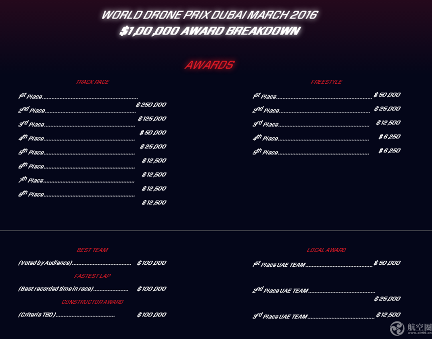 3月11日至12日,迪拜將舉辦世界無人機大獎賽(World Drone Prix),這將成為無人機歷史上最重要的比賽之一,此次比賽的最高獎金達100萬美金,冠軍將獲得25萬美元獎金。