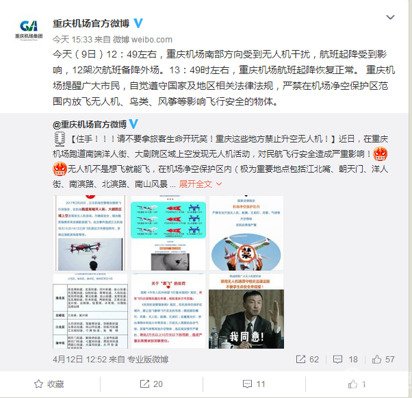 ,5月9日12:49左右,重慶機場南部方向受到無人機干擾,航班起降受到影響,12架次航班備降其他機場。13:49時左右,重慶機場航班起降恢復正常。