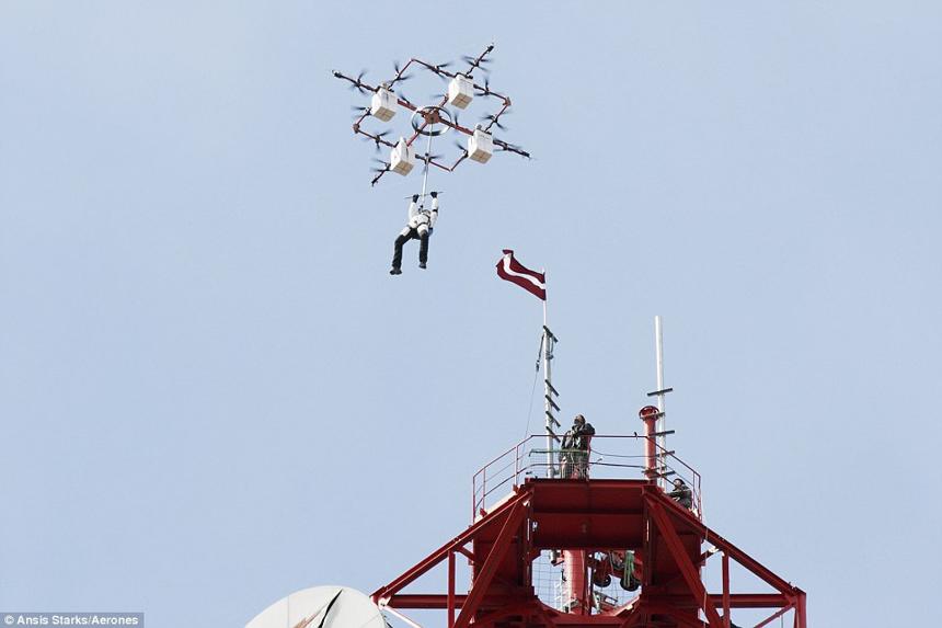 拉脫維亞無人機制造商Aerones 的重型無人機將昂斯特卡恩帶上高空,完成跳傘。Aerones 稱,這在全球尚屬首例,希望今后技術成熟后能將無人機用于營救工作。
