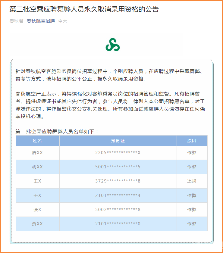 9月11日,春秋航空招聘微信公眾號發布《第二批空乘應聘舞弊人員永久取消錄用資格的公告》。