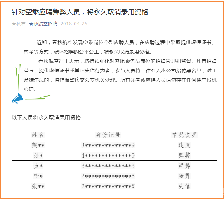 據航空圈了解,此前2018年4月26日,春秋航空發布了第一批空乘應聘舞弊人員名單。春秋航空當時表示,近期,春秋航空發現空乘崗位個別應聘人員,在應聘過程中采取提供虛假證書、替考等方式,破壞招聘的公平公正,被永久取消錄用資格。