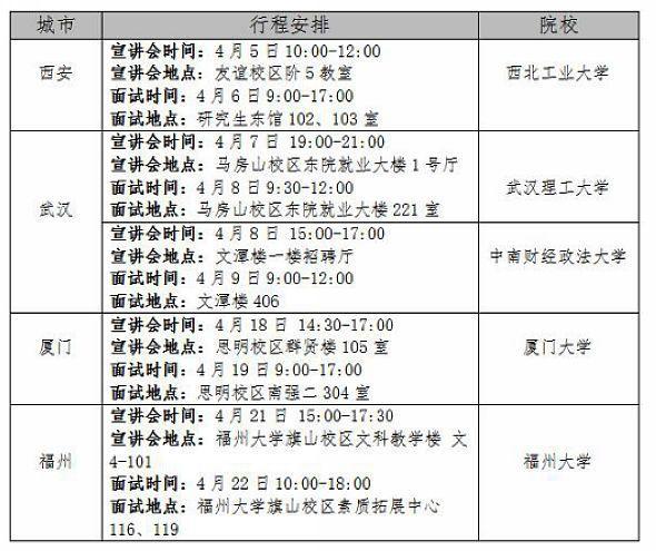 本次的校招將來到西安、武漢、廈門以及福州,以下是具體的面試招聘行程:
