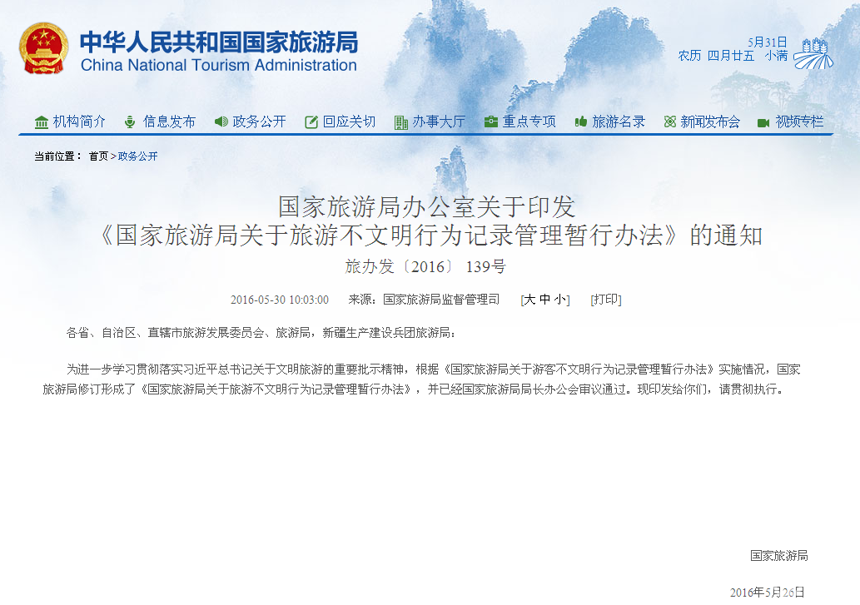 國家旅游局出臺“旅游不文明行為記錄管理暫行辦法”